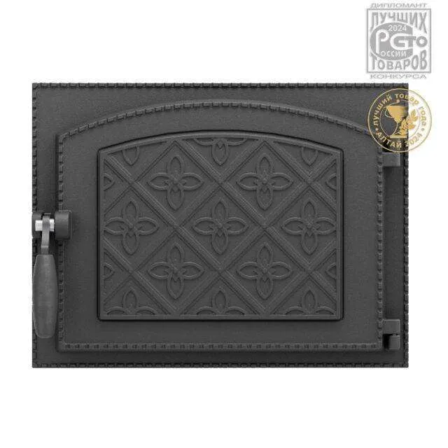 Дверка является герметичной, что обеспечивается запирающим устройством, благодаря которому крышка прижимается к рамке и термошнуром по контуру чугунной вставки с барельефным рисунком. Отходы горения не попадают в помещение, тепло в топке не теряется.